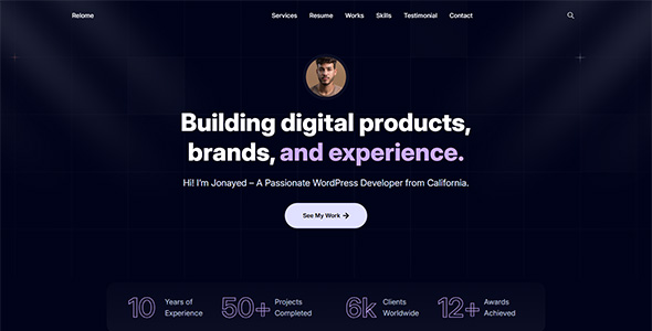 Relome is a clean and minimalist WordPress theme crafted to elevate personal portfolios — ideal for designers, developers, freelancers, and digital service professionals. Powered by Elementor for seamless drag-and-drop editing, Relome delivers a refined, modern look that lets your work and services shine.