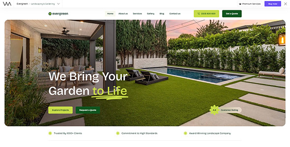 EverGreen is a modern WordPress theme designed for landscaping and gardening businesses. It is perfect for residential and commercial landscapers, lawn care providers, garden service teams, groundskeeping companies, and specialists in landscape design, hardscaping, and outdoor living. The theme also works well for businesses offering tree services, irrigation, drainage grading, pool services, or fencing, helping showcase services and projects professionally.