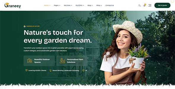 Graneey is a modern and flexible WordPress theme designed for gardening, landscaping, lawn maintenance, and outdoor design businesses. It is ideal for both solo gardeners and full-service landscaping companies, providing a professional platform to showcase services and attract clients online. The theme offers multiple pre-built homepages, beautifully designed inner pages, and customizable layouts to suit different business styles.