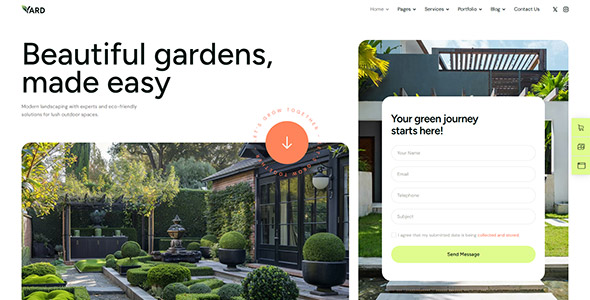 Yard is a clean and colorful WordPress theme created for gardening and landscaping businesses. It is suitable for companies that provide services such as lawn care, landscaping, hedge trimming, patio cleaning, tree maintenance, irrigation, and horticulture. The theme can also be used by arborists, gardening agencies, and businesses that specialize in outdoor design and plant care.